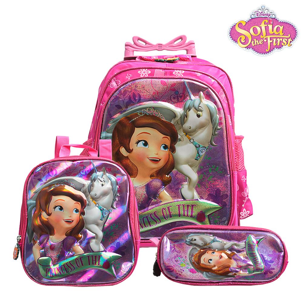 Kit Mochila Escolar Infantil Princesa Sofia Disney Rodinhas, acompanha lancheira e estojo. Agora pode levar sua mochila no seu dia a dia ou acompanhar você na escola. Possui alça de mão reforçada. Sua abertura maior se dá por zíper com puxador. Na parte de dentro possui amplo espaço para a guardar diversos materiais como cadernos, livros e estojos. Na parte da frente, possui bolso com zíper para a guardar pertences de menor tamanho, e bolsos laterais.