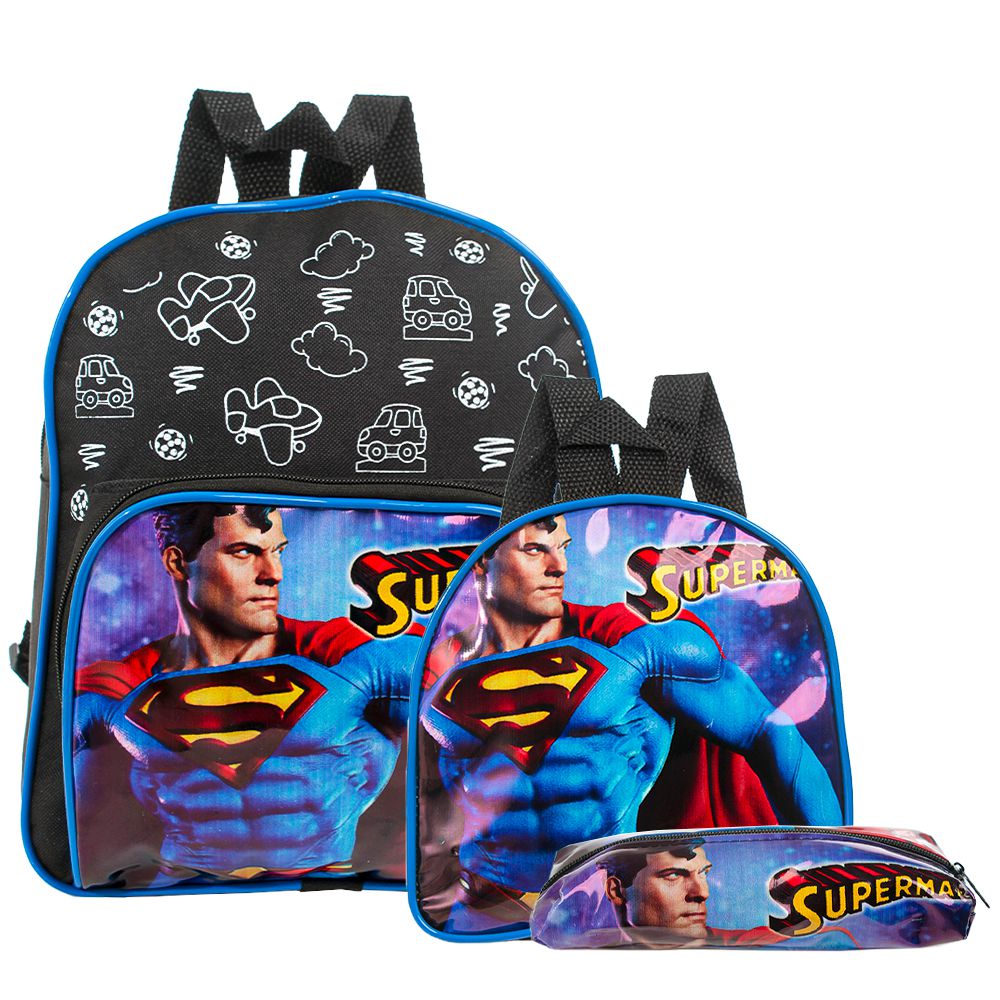 Kit Mochila Escolar Infantil Super Man Costas, acompanha lancheira e estojo. Possui alça de mão reforçada. Agora você pode levar sua mochila no seu dia a dia ou acompanhar você na escola. Sua abertura maior se dá por zíper com puxador. Na parte de dentro possui amplo espaço para a guardar diversos materiais como cadernos, livros e estojos. Na parte da frente, possui bolso com zíper para a guardar pertences de menor tamanho.