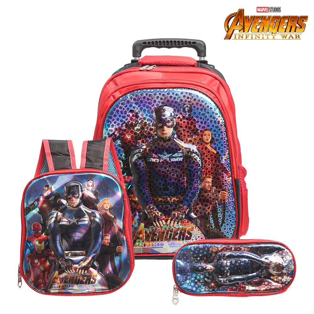 Kit Mochila Escolar Infantil Vingadores de Rodinhas, acompanha lancheira e estojo. Agora pode levar sua mochila no seu dia a dia ou acompanhar você na escola. Possui alça de mão reforçada. Sua abertura maior se dá por zíper com puxador. Na parte de dentro possui amplo espaço para a guardar diversos materiais como cadernos, livros e estojos. Na parte da frente, possui bolso com zíper para a guardar pertences de menor tamanho, e bolsos laterais.