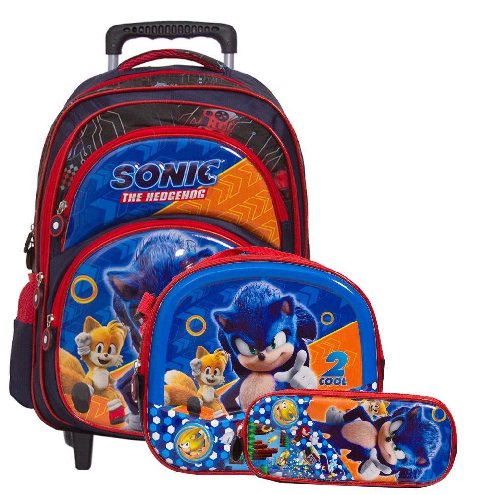 Kit Mochila Escolar Infantil Sonic Rodinhas, acompanha lancheira e estojo. Possui alça de mão reforçada. Agora você pode levar sua mochila no seu dia a dia ou acompanhar você na escola. Sua abertura maior se dá por zíper com puxador. Na parte de dentro possui amplo espaço para a guardar diversos materiais como cadernos, livros e estojos. Na parte da frente, possui bolso com zíper para a guardar pertences de menor tamanho e bolsos laterais.