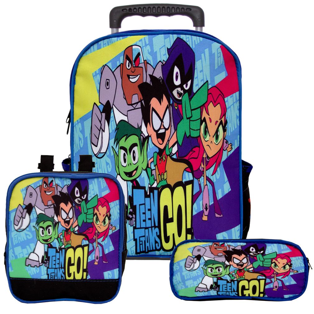 Kit Mochila Escolar Infantil Jovens Titãs Rodinhas, acompanha lancheira e estojo. Possui alça de mão reforçada. Agora você pode levar sua mochila no seu dia a dia ou acompanhar você na escola. Sua abertura maior se dá por zíper com puxador. Na parte de dentro possui amplo espaço para a guardar diversos materiais como cadernos, livros e estojos. Na parte da frente, possui bolso com zíper para a guardar pertences de menor tamanho e bolsos laterais.