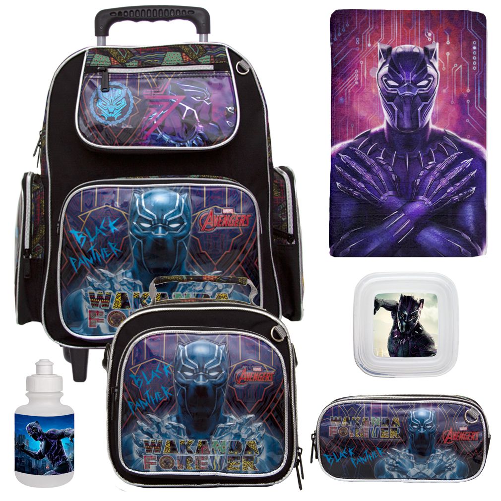 Kit Mochila Escolar Infantil Pantera Negra Rodinhas acompanha lancheira, estojo, garrafinha, pote e toalha. Possui alça de mão reforçada. Agora você pode levar sua mochila no seu dia a dia ou acompanhar você na escola. Sua abertura maior se dá por zíper com puxador. Na parte de dentro possui amplo espaço para a guardar diversos materiais como cadernos, livros e estojos. Na parte da frente, possui bolso com zíper para a guardar pertences de menor tamanho e bolsos laterais.