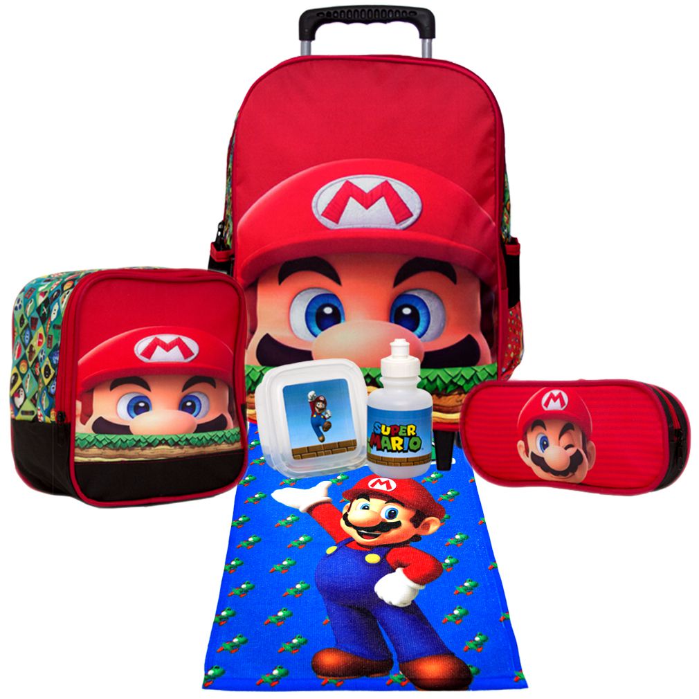 Kit Mochila Escolar Infantil Super Mario Rodinhas, acompanha lancheira, estojo, garrafinha, pote e toalha. Possui alça de mão reforçada. Agora você pode levar sua mochila no seu dia a dia ou acompanhar você na escola. Sua abertura maior se dá por zíper com puxador. Na parte de dentro possui amplo espaço para a guardar diversos materiais como cadernos, livros e estojos. Na parte da frente, possui bolso com zíper para a guardar pertences de menor tamanho e bolsos laterais.