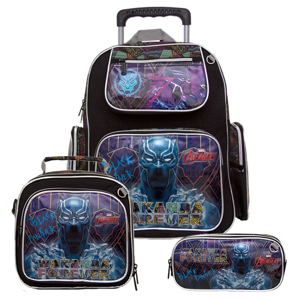 Kit Mochila Escolar Infantil Pantera Negra Rodinhas, acompanha lancheira e estojo. Possui alça de mão reforçada. Agora você pode levar sua mochila no seu dia a dia ou acompanhar você na escola. Sua abertura maior se dá por zíper com puxador. Na parte de dentro possui amplo espaço para a guardar diversos materiais como cadernos, livros e estojos. Na parte da frente, possui bolso com zíper para a guardar pertences de menor tamanho e bolsos laterais.
