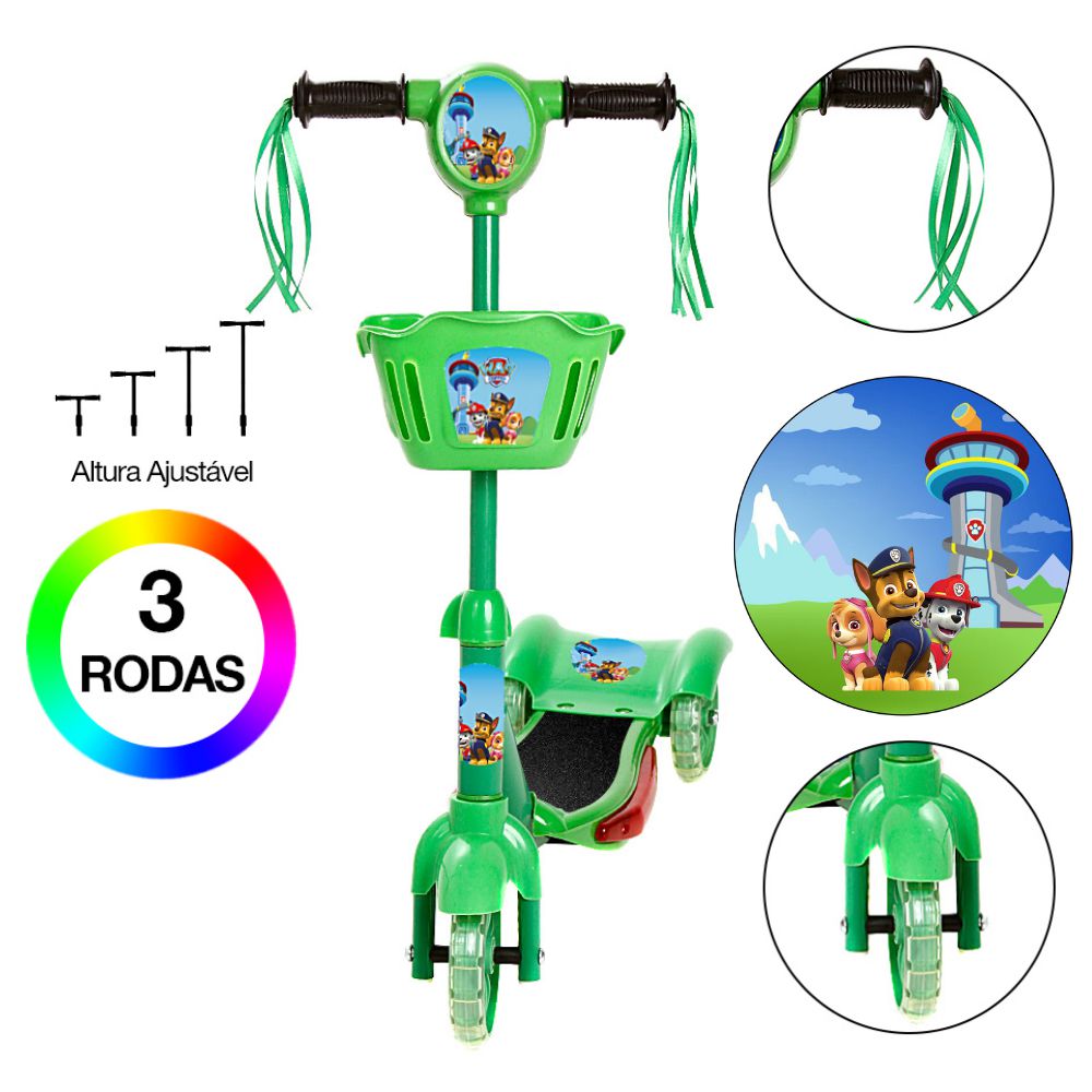 patinete de tres rodas, cestinha, criança, infantil, dm toys, led, feminino, masculino, verde, meninos, brinquedo, meninas,