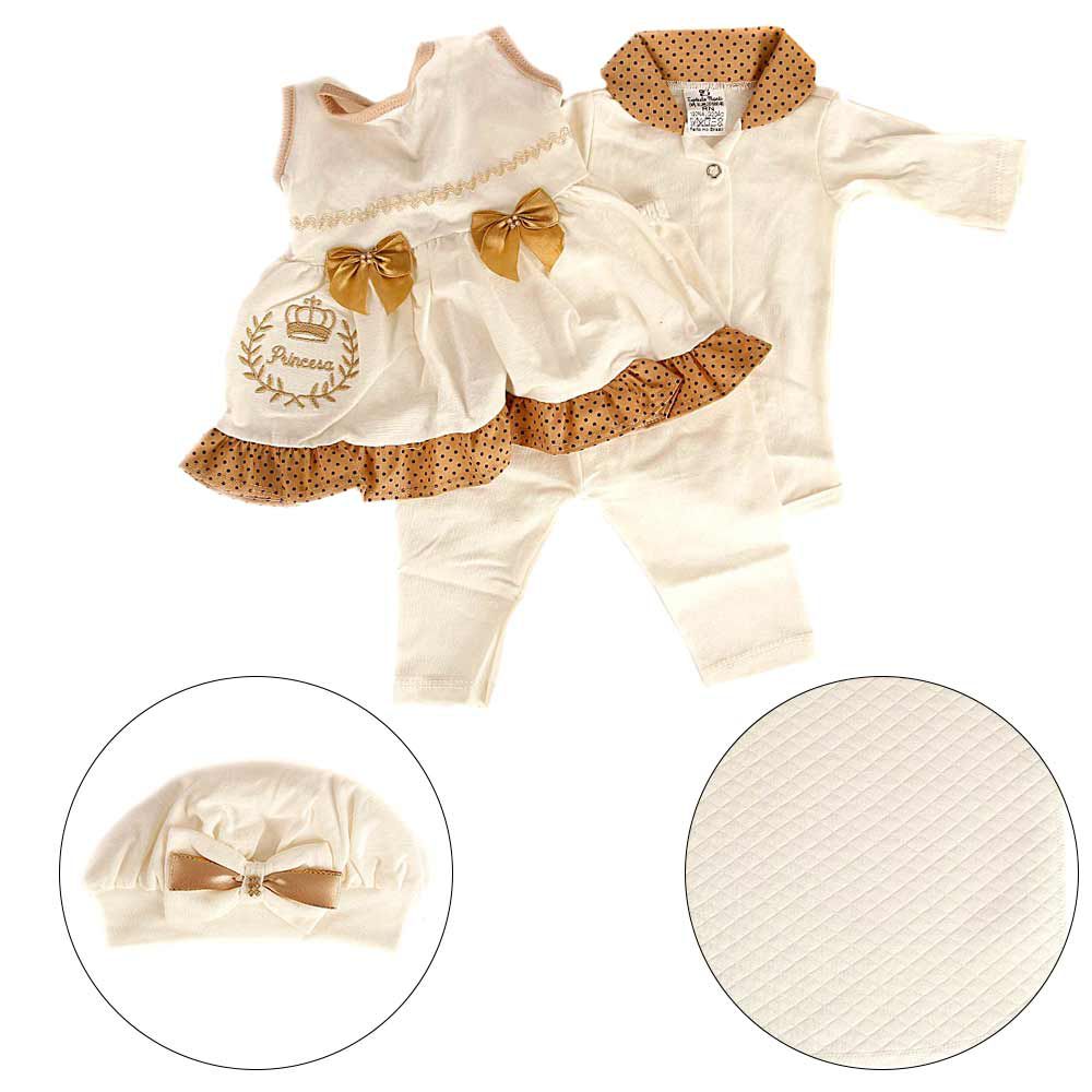 Conjunto de Roupa de Luxo Bege e Marrom Poa com 5 peças, é uma excelente escolha para o seu bebê, com um acabamento de ótima qualidade e super lindo, ideal para a sua princesinha! Nosso enxoval é totalmente diferente do que você já viu, contendo uma touquinha com lacinho, um vestidinho, um body, uma calça e uma manta, para deixar sua filha confortável e super linda!